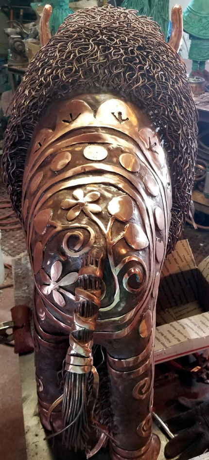 Dignity's HopeIt’s a mother’s sacred responsibility to nurture a child’s life. She renews and maintains cultural knowledge with love, dreaming of her child’s future. Honoring the cultural significance, endurance, and adaptation of the bison and the people, her raised Iroquois patterns represent: Strawberry (heart berry); Two-Row wampum (journey side by side); Grandmother Moon (Natural cycles of women); Father Sky (sky dome protects Mother Earth); and the Wind swirls on the baby (bring it strength). Hand-wrought cut copper assemblage welded in both copper wire and hard silver solder using oxy/acetylene gas. Each hair individually welded and styled; raised symbols- cut, welded, ground and polished. Measurements : 32" H X 48" L X 24" W ••• Dignity's Hope Awards•••
